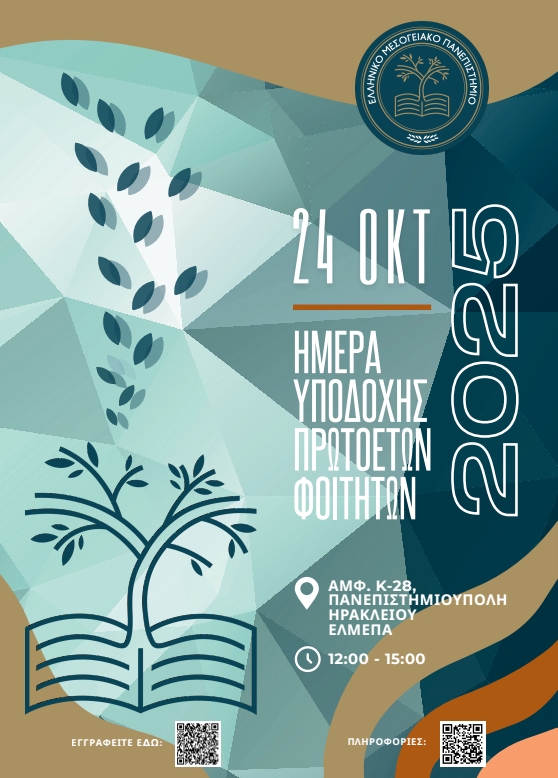 Το Ελληνικό Μεσογειακό Πανεπιστήμιο (ΕΛΜΕΠΑ) καλωσορίζει τους νέους φοιτητές και τις νέες φοιτήτριες του για το ακαδημαϊκό έτος 2025–2026, με μια εορταστική εκδήλωση γνωριμίας που θα πραγματοποιηθεί την Παρασκευή 24 Οκτωβρίου 2025, ώρα 12:00–15:00, στο Αμφιθέατρο «Β. Ζαχαρόπουλος» (Κ-28), στην Πανεπιστημιούπολη Ηρακλείου.