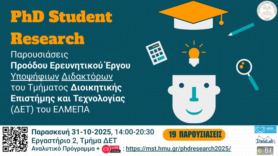 Το Τμήμα Διοικητικής Επιστήμης και Τεχνολογίας της Σχολής Επιστημών Διοίκησης και Οικονομίας του ΕΛΜΕΠΑ έχει την τιμή να σας προσκαλέσει στις Παρουσιάσεις Προόδου Ερευνητικού Έργου των Υποψήφιων Διδακτόρων του Τμήματος που θα πραγματοποιηθούν την Παρασκευή 31 Οκτωβρίου 2025 και ώρα 14:00 στο Εργαστήριο 2 του Τμήματος.